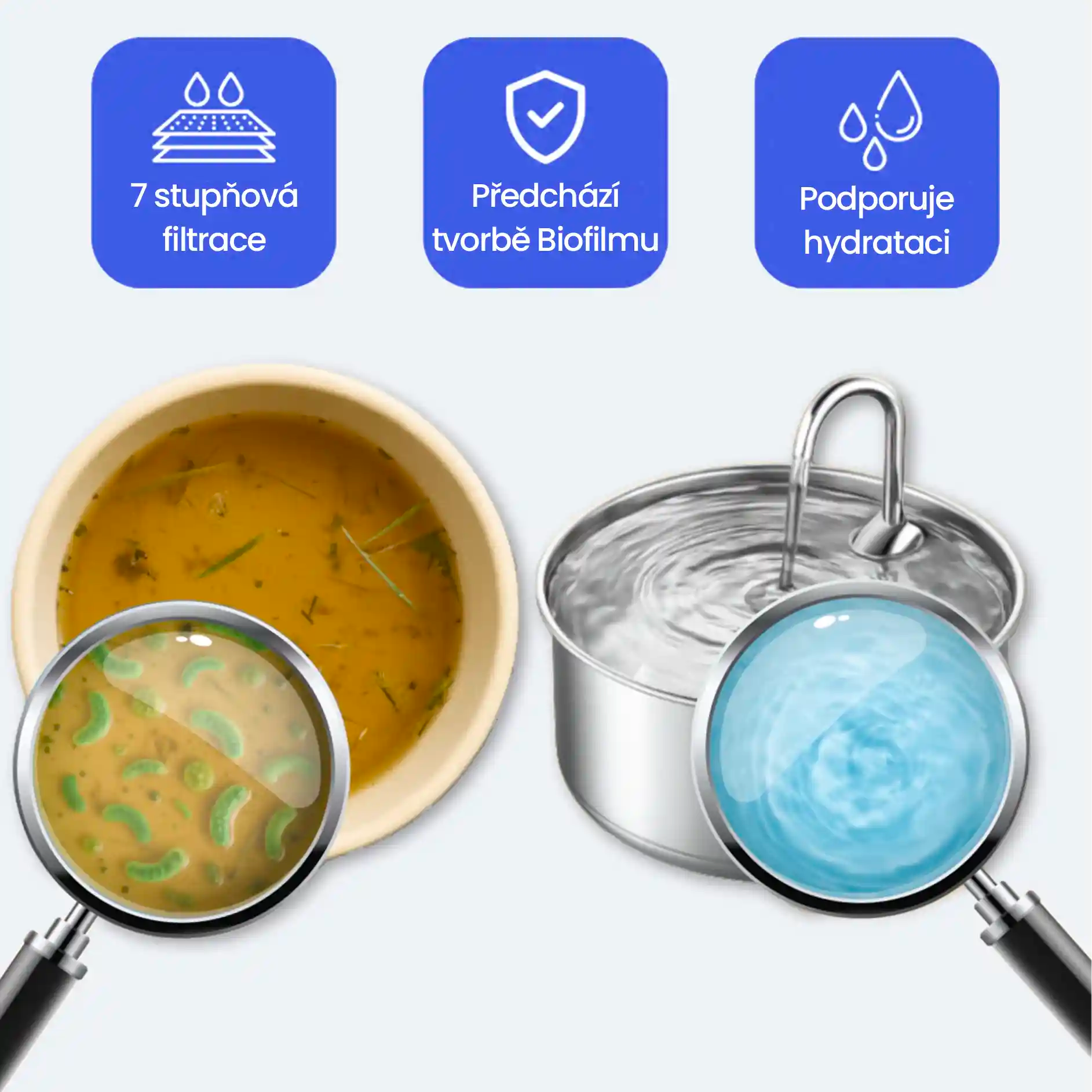 Fontánka Furrient využívá dynamickou cirkulaci, která do vody neustále přidává kyslík – díky tomu je pro psy přirozeně lákavější než stojatá voda v misce. Stálý oběh v kombinaci s 5stupňovou filtrací účinně odstraňuje nečistoty, chlupy a pachy a zlepšuje celkovou kvalitu vody. Konstrukce z nerezové oceli 304 navíc brání množení bakterií, které se u plastových fontán tvoří mnohem častěji.