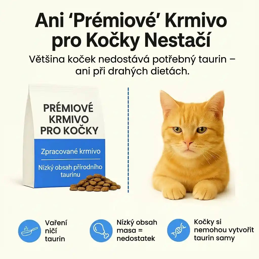 I když je mnoho krmiv označeno jako "kompletní a vyvážené", moderní zpracování (vaření, tepelná úprava, skladování) může zničit až 70% přirozeného taurinu. Navíc některé levnější proteiny (např. rostlinné) neobsahují téměř žádný taurin. Furrient Taurin vyplňuje tuto mezeru a zajišťuje, že vaše kočka dostává dostatek těchto esenciálních živin.